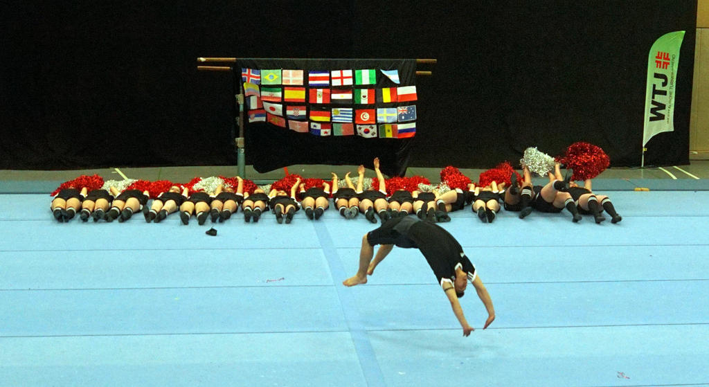 Unter dem Motto „Fußballfieber“ zeigte die Formation „DanceExplosion“ vom TV Dülmen eine fetzige Choreografie. 18 Tänzerinnen und 14 Turnerinnen unter der Leitung von Diana Wiesmann boten eine viel umjubelte Performance. Zum Abschluss bildeten ein Teil der Tänzer die beiden Buchstaben TV. Für die Darbietung gab es von der Jury die Bewertung ausgezeichnet. Und vor allem einen der drei Plätze im Bundesfinale, für das sich auch die Clowns des Werler TV und „Space Skip Visitors“ des TSV Wewer qualifizierten.