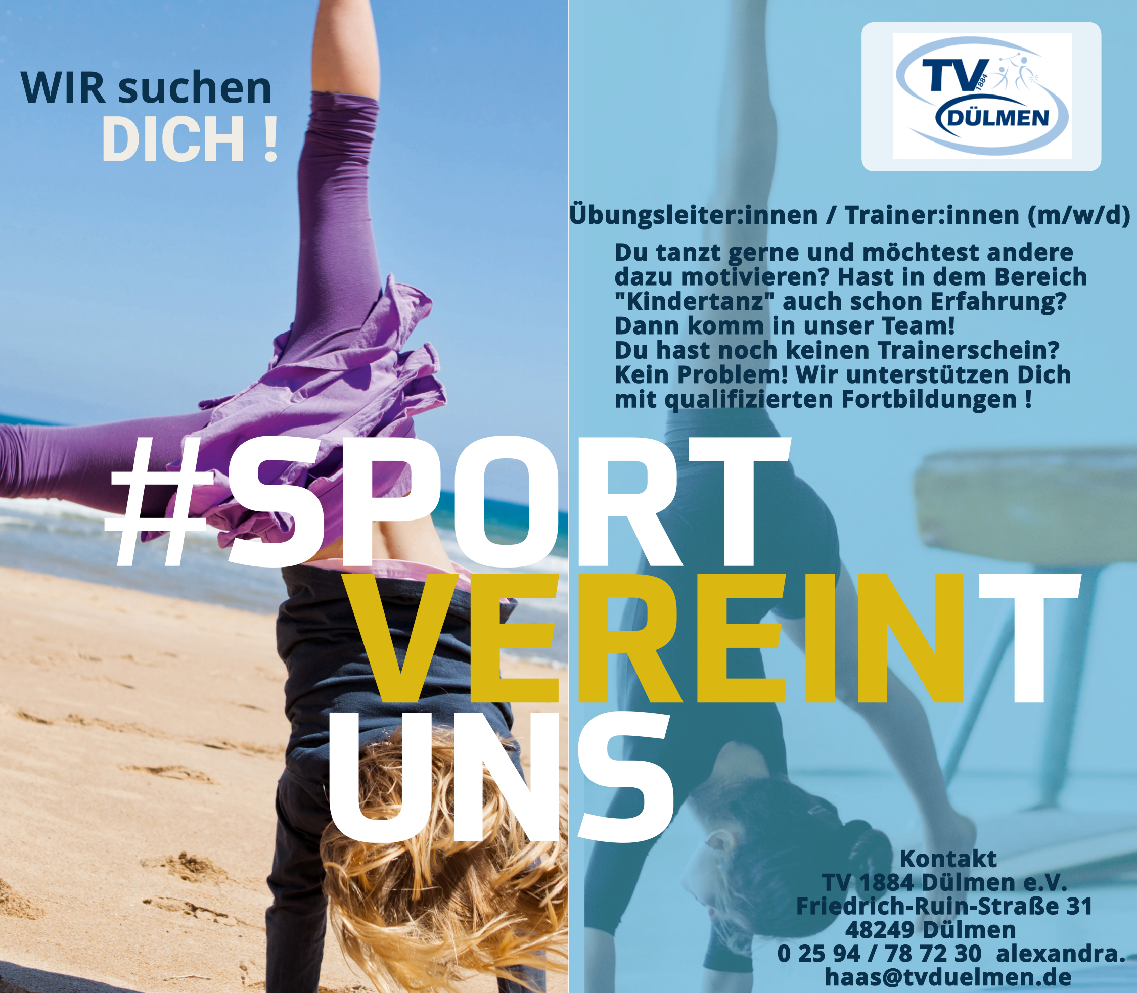 Du tanzt gerne und möchtest dies anderen Kinder gerne mit Freude vermitteln? Du hast auch schon Erfahrungen im Bereich "Kindertanz" ? Dann freuen wir uns Dich kennenzulernen. Gerne unterstützen wir Dich mit qualifizierten Weiterbildung und Fortbildung in diesem Bereichen und sind für deine Idee völlig offen. Wir bieten im Bereich des Kindertanzens im Alter von 3-18 Jahren Kurse an und möchten dies gerne aufgrund der hohen Nachfrage noch erweitern.