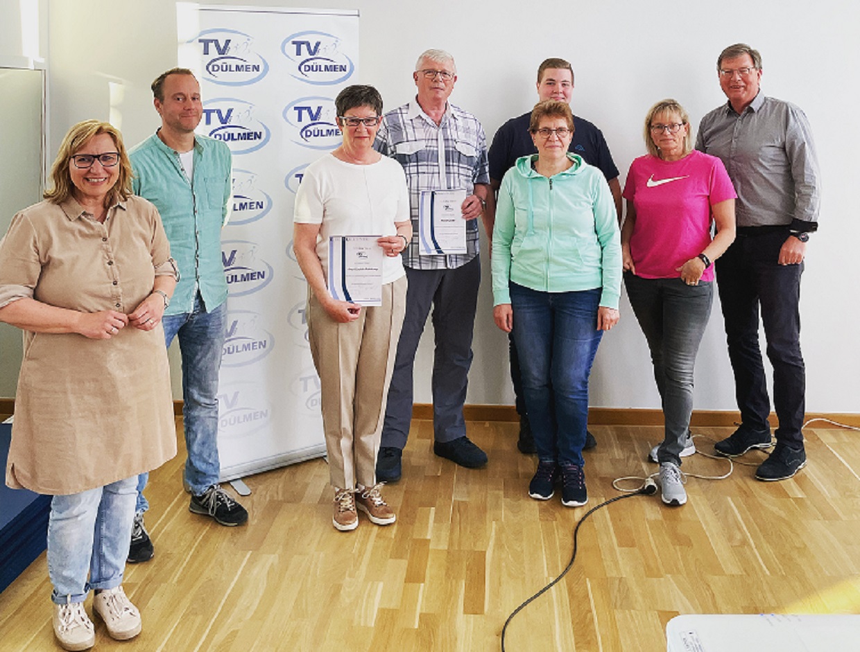von links nach rechts: Claudia Hypki (Vorstandsvorsitzende), Andreas Hanning (35 Jahre), Anna-Elisabeth Achterkamp (35 Jahre), Helmut Gödde (45 Jahre), Gertrud Wagner (25 Jahre), Fabian Reinert (Vorstand Hallen- u. Gebäudeverwaltung), Cati Ramberg (Vorstand Sportbetrieb), Reimund Thiele (Vorstand Finanzen)