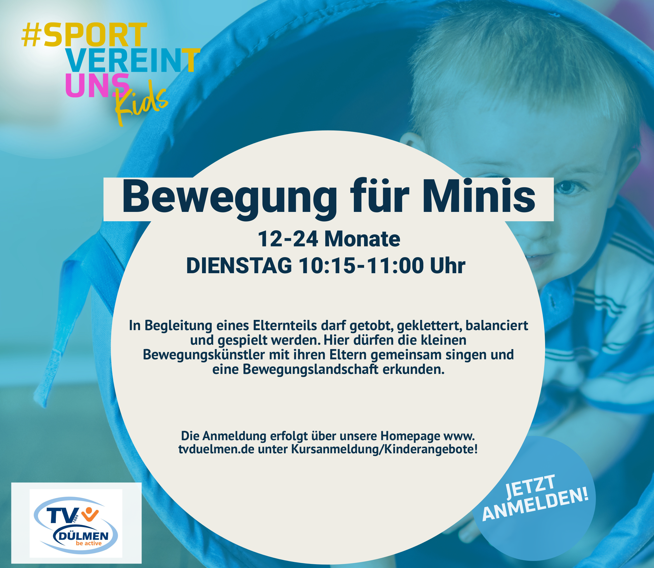 Ab dem 07.06.2022 beginnt bei uns für die kleinsten Bewegungskünstler in Begleitung eines Elternteils ein abwechslungsreiches Spiel - & Sportangebot. Es darf getobt, geklettert, balanciert und gespielt werden.Es werden aufgrund der hohen Nachfrage dieses Mal zwei Gruppen angeboten. Dienstags von 10:15 - 11:00 Uhr sind die 12 - 24 Monate alten Kids an der Reihe. Veranstaltungsort ist die FitnessArena im Bendixkomplex, Friedrich - Ruin - Str. 31.