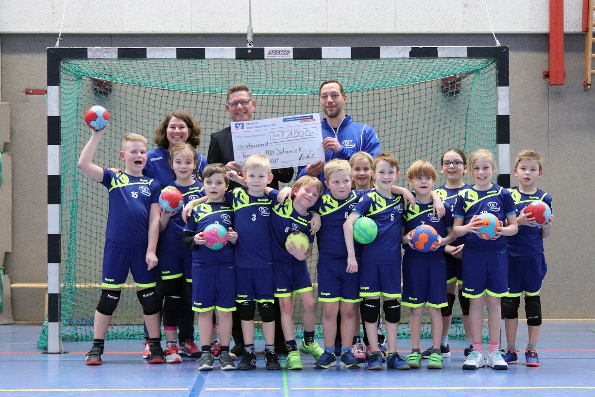 Den aktuellen Helden der Handball-WM nacheifern, das wollen auch die Jüngsten des TV Dülmen. Damit dies weiter gelingt, unterstützt die VR Bank Westmünsterland die Jugendarbeit mit einer Spende von eintausend Euro. Handballjugendwart Christof Bödiger und Trainerin Kristina Weber freuen sich gemeinsam mit der F-Jugend über den Scheck, den Dirk Gärtner, Regionalleiter der VR-Bank Westmünsterland in Dülmen, überreichte.