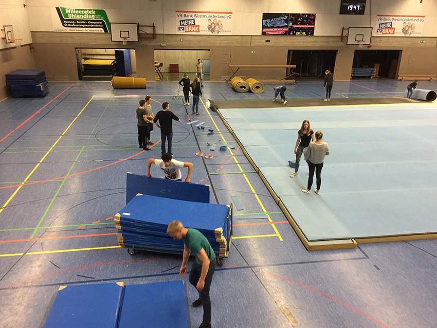 Zahlreiche Turner und Eltern packten mit an, um die Matten in die Halle zu bringen und direkt aufzubauen. Die Turner konnten es kaum abwarten, die neue Bodenfläche auszuprobieren.