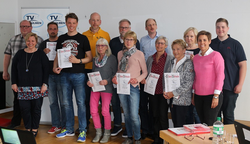 hintere Reihe von links nach rechts: Stefan Schulze Hobeling (35-jährige Mitgliedschaft), Christian Nacke (30), Dirk Erpenstein (35), Wolfgang Elsbernd (40), Volker Bierbaum (35), Elisabeth Rusche (25), Fabian Reinert (Vorstand Hallen- u. Gebäudeverwaltung)