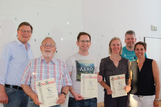 Für 25jährige Mitgliedschaft wurden geehrt: Horst Traud, Christoph Bolle und Anja Frerichmann (von links nach rechts). Ebenfalls auf dem Foto Reimund Thiele, Vorstand für Finanzen (links), Marc Hagemann, Vorstand Hallen- und Gebäudeverwaltung (2. von rechts) und Tanja Visarius, Vorstand Sportbetrieb (rechts). Insgesamt wurden 12 Mitglieder für 25-, 30-, 35- und 40-jährige Mitgliedschaft geehrt.